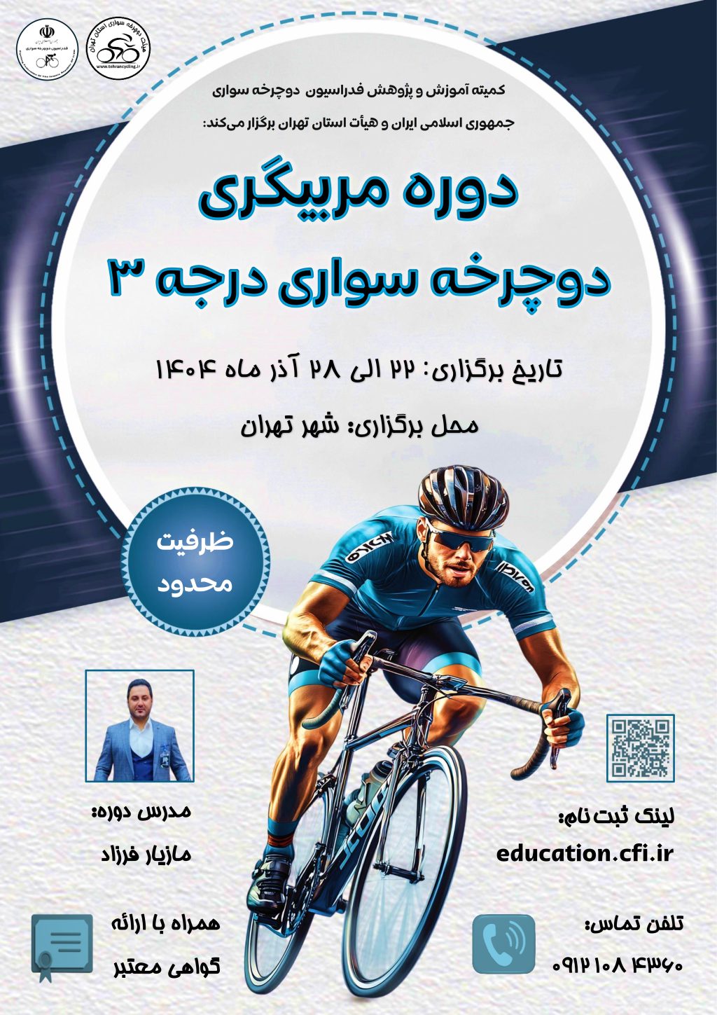دوره مربیگری دوچرخه‌سواری درجه ۳ با همکاری کمیته آموزش و پژوهش فدراسیون دوچرخه‌سواری جمهوری اسلامی ایران و هیأت استان تهران در ماه جاری برگزار می‌شود.