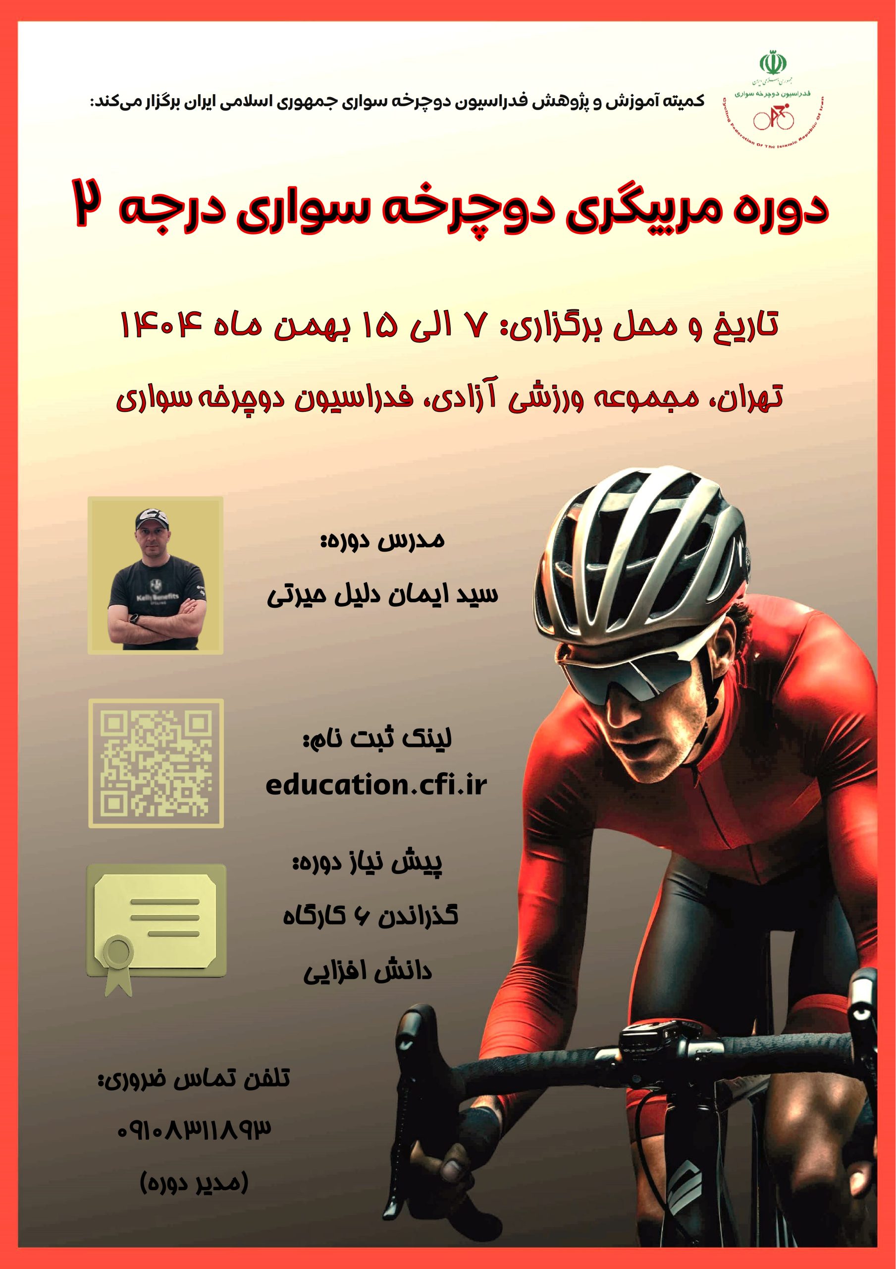 دوره مربیگری دوچرخهسواری درجه ۲ توسط کمیته آموزش و پژوهش فدراسیون دوچرخهسواری جمهوری اسلامی ایران در زمستان سال جاری برگزار میشود.