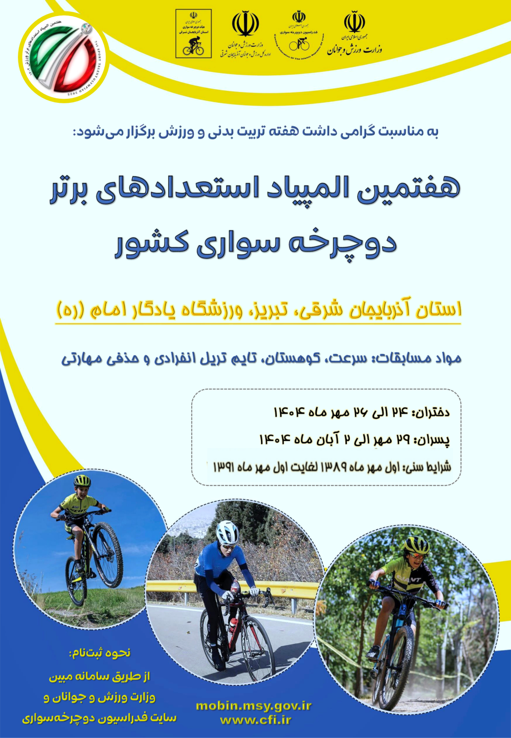 به گزارش روابط عمومی فدراسیون دوچرخهسواری، هفتمین دوره مسابقات دوچرخهسواری المپیاد استعدادهای برتر ورزش کشور (دختران و پسران) در ماه جاری به میزبانی استان آذربایجان شرقی، شهر تبریز برگزار میشود.